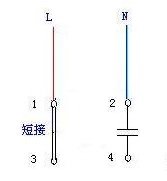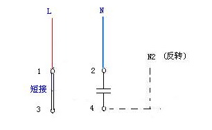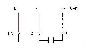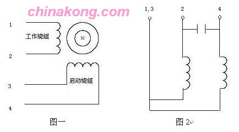 当两绕组完全一样,电机可能是三端子接线,1,3为两绕组的公共接线端,接交流电源的L, 2/4端子之间联有启动电容, 如果交流电源的N端接端子2为正转,则N改接端子4为反转;如果是四端子,见图4接线;