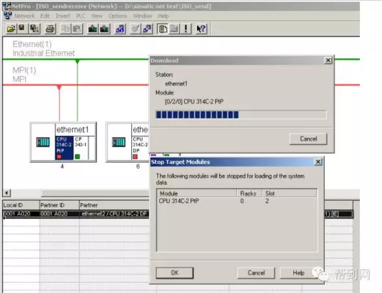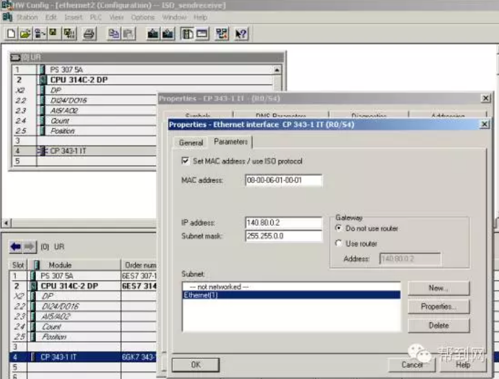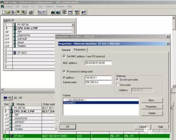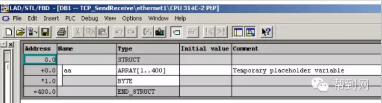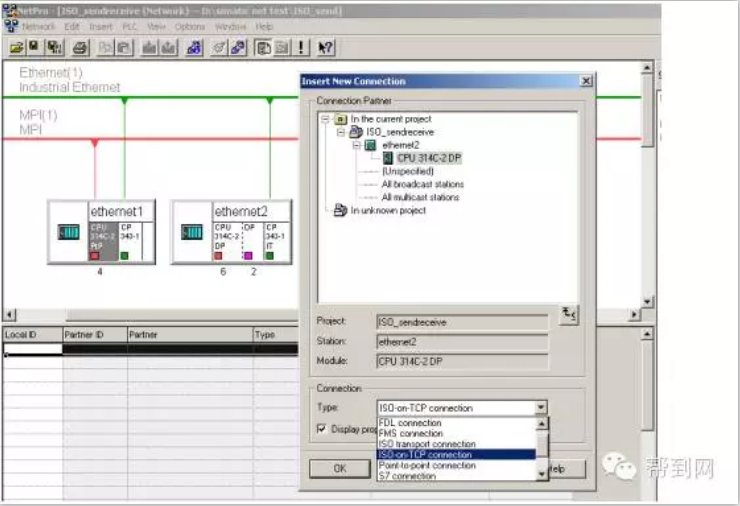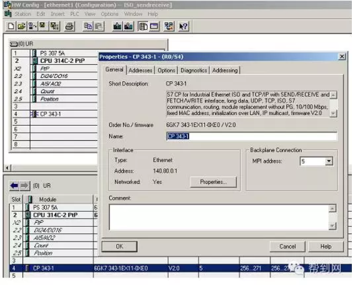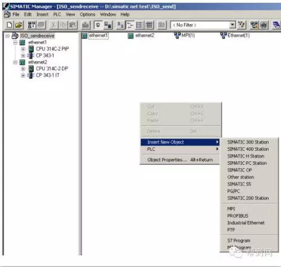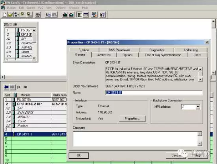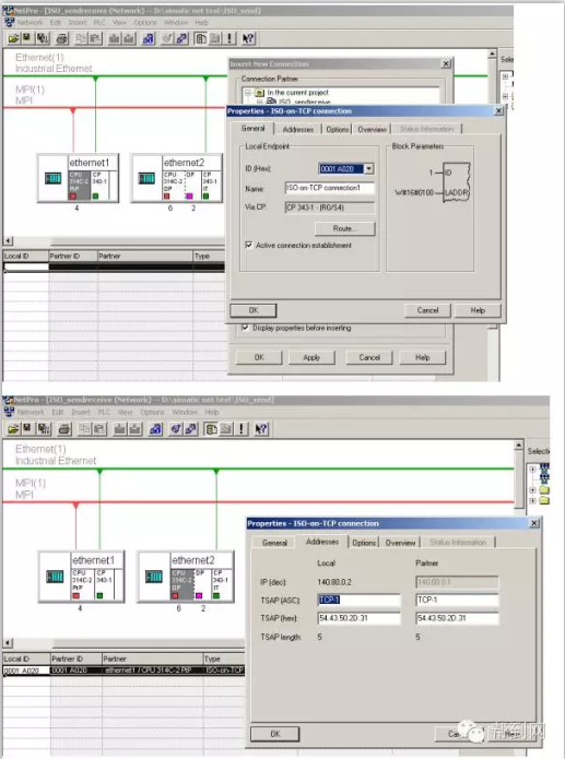 http://www.chinakong.com/upload/upload13/201602191653108.png 帮到网技术解读: 帮到网技术团队由数十名专业的电气工程师组成的,以解决客户技术问题为宗旨,为客户提供无忧的售前售后服务。 用户问:如何通过CP343-1模块实现S7-300之间的以太网通讯? 技术团队答:首先搭建一套测试设备,然后参考下面步骤实现: 一、 硬件组态 2套S7-300系统由PS307电源、CPU314C-2DP、CPU314C-2PTP、CP343-1、CP343-1 IT、PC、CP5611、STEP7组成。 如下将向您一步一步展示如何实现2套S7-300之间的以太网通讯: 第一步:打开SIMATIC Manager,根据我们系统的硬件组成,进行系统的硬件组态,如图:插入2个S7300的站,进行硬件组态: http://www.chinakong.com/upload/upload13/201602191653348.png 分别组态2个系统的硬件模块: http://www.chinakong.com/upload/upload13/201602191653528.png 设置CP343-1、CP343-IT模块的参数,建立一个以太网,MPI、IP地址: http://www.chinakong.com/upload/upload13/201602191654018.png http://www.chinakong.com/upload/upload13/201602191654138.png http://www.chinakong.com/upload/upload13/201602191654228.png http://www.chinakong.com/upload/upload13/201602191654318.png 二、 网络组态 组态完2套系统的硬件模块后,分别进行下载,然后点击Network Configration按钮,打开系统的网络组态窗口NetPro,选中CPU314,如下图: http://www.chinakong.com/upload/upload13/201602191654478.png 在窗口的左下部分点击鼠标右键,插入一个新的网络链接,并设定链接类型为ISO-on-TCP connection 或 TCP connection或 UDP connection 或 ISO Transport connection,如下图: http://www.chinakong.com/upload/upload13/201602191655018.png 点击OK后,弹出链接属性窗口,使用该窗口的默认值,并根据该对话框右侧信息进行后面程序的块参数设定: http://www.chinakong.com/upload/upload13/201602191655138.png 当2套系统之间的链接建立完成后,用鼠标选中图标中的CPU,分别进行下载,这里略去CPU314C-2DP的下载图示: http://www.chinakong.com/upload/upload13/201602191655258.png 三、 程序编程 到此为止,系统的硬件组态和网络配置已经完成。下面进行系统的软件编制,在SIMATIC Manager界面中,分别在CPU314C-2PTP、CPU314C-2DP中插入OB35定时中断程序块和数据块DB1,DB2,并在两个OB35中调用FC5(AG_Send)和FC6(AG_Recv)程序块,如下图: http://www.chinakong.com/upload/upload13/201602191655348.png 创建DB1、DB2数据块,如下图: http://www.chinakong.com/upload/upload13/201602191655458.png 到此为止,2套控制程序已经编制完成,分别下载到CPU当中,将CPU状态切换至运行状态,就可以实现S7-300之间的以太网通讯了。 帮到网:www.bangdaow.com
