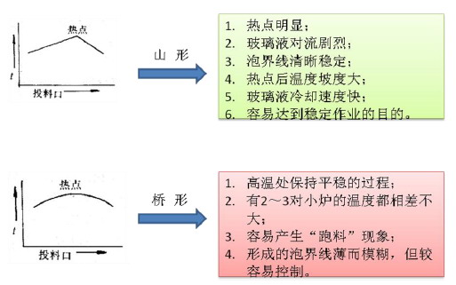 1. 对于平板玻璃池窑,一般测小炉挂钩砖或小炉垛的温度; 2. 对于马蹄形和纵火焰池窑则测胸墙温度。 制定“山形”温度曲线时应注意三个问题 1. 最高温度值:对于钠钙玻璃一般是1550~1600℃; 2. 热点位置:设5对小炉的在3~4号小炉之间、设6对小炉的在4号小炉或稍后一些、设7对或8对小炉的在4~5号小炉之间; 3. 热点与1号小炉的温度差:一般为100~130℃。 对于马蹄焰或纵焰池窑,一般只控制热点位置和热点温度。