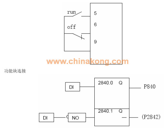 MM440使用三线控制,一个起动按钮,一个停止按钮控制变频器运行。 MM440默认为使用2线控制,只用一个开关量做起动/停止控制。用户可通过使用内部自由功能块实现此功能。 相关参数设置 P0700[0]=2选择命令源 P0701[0]=99选择DI1功能 P0702[0]=99选择DI2功能 P0840[0]=2841选择运行命令源 P2800[0]=1使能自由功能块 P2801[9]=1激活非门 P2801[14]=1激活RS触发器 P2828=722.1非门 P2840[0]=722.0 RS触发器置位端 P2840[1]=2829 RS触发器复位端