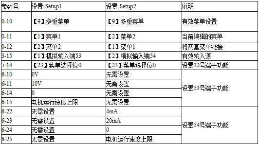 丹佛斯变频器有4个参数菜单,可单独对它们进行设置,这不仅使变频器拥有非常强大的灵活性,而且还可以解决高级控制功能方面的问题,因此往往能省下购买外部控制设备的成本,例如可以用这些参数来设置变频器,使其按照两个菜单中的给定参考值动作。菜单1以53号端子接收电位器信号给定参考值,菜单2以54号端子接收电流信号给定参考值,除基本电机参数外,相关参数设置如下: