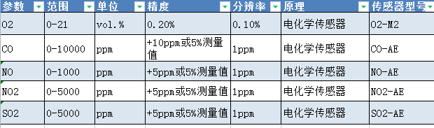 烟气分析仪中检测O2、CO、SO2、NO2和NO的传感器: