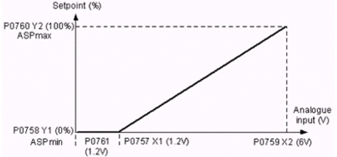 由于MM420的模拟量输入信号是0-10V,因此要采用4-20mA电流信号,必须在控制端子3和4之间连接一合适的电阻。 Example: 使用一个300欧姆的电阻。 如图所示,同时有关一些模拟量输入的参数需要重新设定。 P0757(值 X1)=(4mA*300)=1.2V P0759(值 X2)=(20mA* 300)=6.0V P0761(死区的宽度)=1.2V 以上的例子是使用一个300欧姆的电阻,因此如果使用不同阻值的电阻时,P0757-P0761需要 重新进行计算。