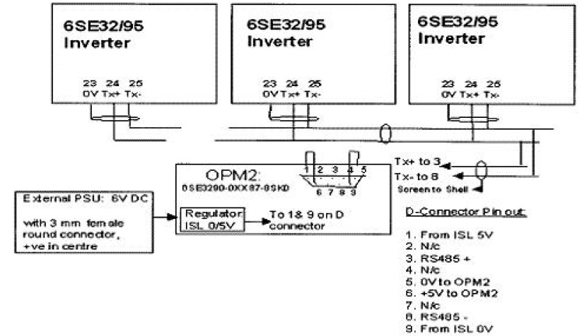 请参看如下示意图: 注意:对6SE92变频器,没有23~25端子。可以用变频器前面板上的D型连接器来代替,连接到其3和8脚。 这种连接方式也可以用于6SE32/6SE95型变频器。