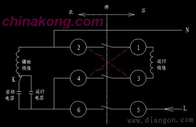 反转时电流方向:L>>>5>>>6>>>4>>>1>>>运行绕组>>>3>>>2>>>N