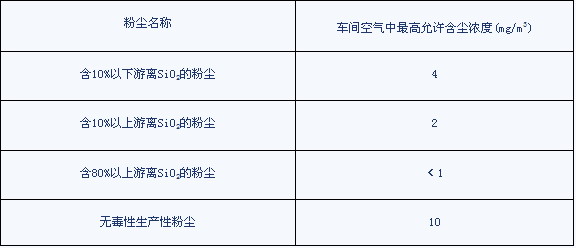 粉尘的浓度是指空气中粉尘的含量,通常以每立方米空气中所含粉尘的毫克数(mg/m3)或克数(g/m3)来表示。粉尘作业中,粉尘浓度越大,对环境的污染也就越大,吸入肺中的粉尘含量越高,对人体的危害也越大。为了保护工人的健康,保护环境,国家规定了车间空气中各种粉尘最高允许浓度,即粉尘卫生标准。对硅酸盐行业来讲,我国现行的工业企业设计卫生标准,对生产性粉尘是按游离二氧化硅的含量来确定作业区浓度的,见表1。