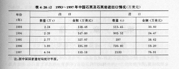 表4.20.12 1993~1997年中国石英及石英岩进出口情况(万美元)