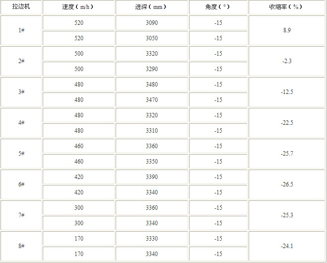 原板宽:4150,内牙:3860,主传动速度:175m/h,拉引量为645吨/日。厚度:14.75mm、14.87mm、14.87mm、14.82mm,平均厚度:14.83mm