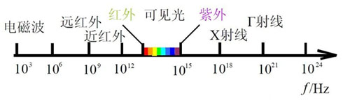 电磁波按波长的分布及各波长区域的定义(称为电磁波谱)。电磁波谱的频率范围很宽,涵盖了由宇宙射线到无线电波(102~1025Hz)的宽阔频域。光辐射仅仅是电磁波谱中的一小部分,它包括的波长区域从几纳米到几毫米,即10-9~10-3m的范围。在这个范围内,只有0.38~0.78μm的光才能引起人眼的视觉感,故称这部分光为可见光。