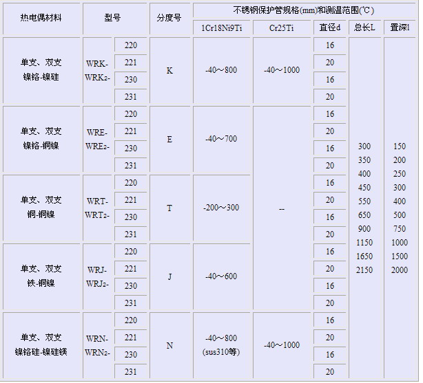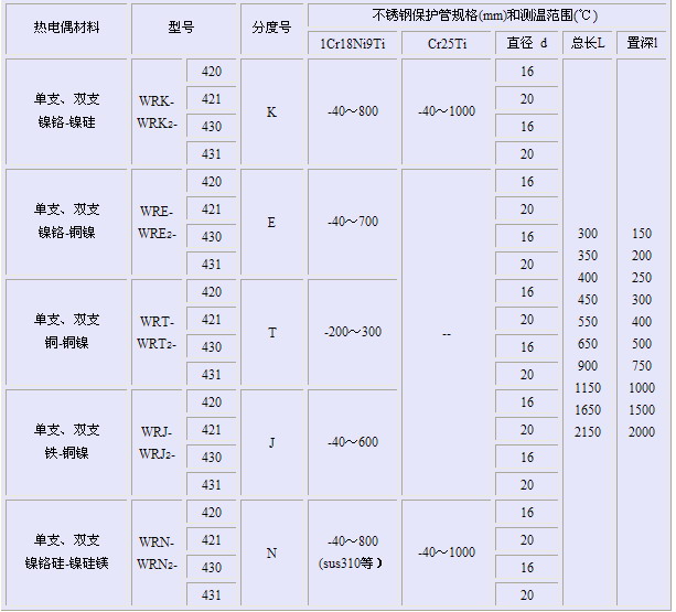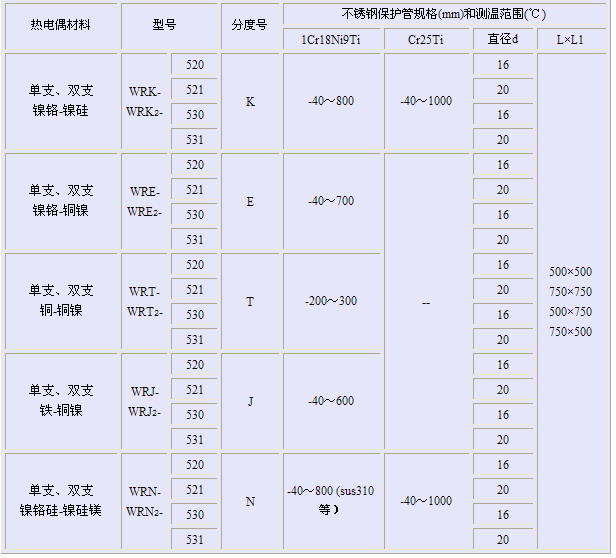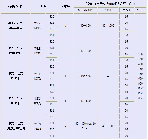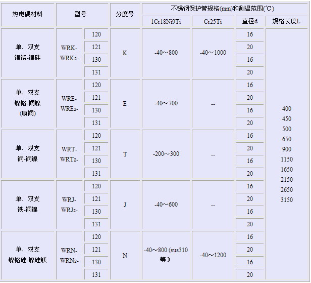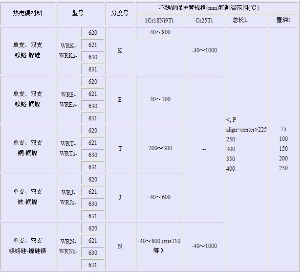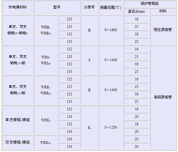 1、无固定装置瓷保护管热电偶 示意图: 保护管直径与长度规格表(mm) 无固定装置瓷保护管热电偶的综合特性