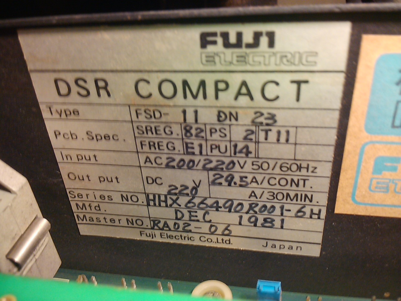 一台富士FUJI 直流主轴驱动(DC SPINDLE DRIVE)产品名DSR COMPACT 型号 FSD-11DN23 ,需要知道外部接线,如正反转如何接,有没有使能急停等。 机器是随机床从日本进来的,由于接线搞乱了,不知道如何控制运行了,在下列端子上原来是有接线的AXC,AXA,88MF,52X,M;S1,S3,S6;FS,M。用分号隔开的是同一排的端子。 如果有相关手册或资料,或者给我一些提示,还望发到我邮箱ycfzx@yahoo.com.cn 相关型号的产品资料也可以,只要有所参考就行了。 谢谢。 http://www.chinakong.com/upload/upload12/201202131456348.jpg