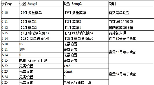 两种参考值来源,分时有效,这类情况可通过使用两套菜单来实现。 以电位器给定参考值和电流给定参考值为例,53号端子接收电位器信号,54号端子接收电流信号,除基本电机参数外,相关参数设置如下: 必须按照表中顺序设置参数,保证同一端子在两套菜单中功能一致,如LCP102上菜单状态闪烁,则两套菜单的设置内容可能冲突,该种情况下,请初始化变频器参数,重新设置。 通过调节控制面板下面的拨码开关,将54号端子切换为电流信号输入。