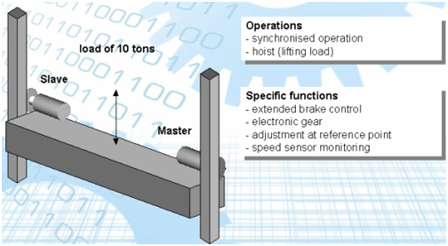 在双机抓斗应用中,TP2200V 系列变频器采用主从控制模式,抓斗上升时主机和从机采用负荷分配的运行方式,抓斗下降时主机和从机采用速度同步的运行方式,由于使用了电子齿轮功能,可自动调节两端负载使其保持相对平衡。