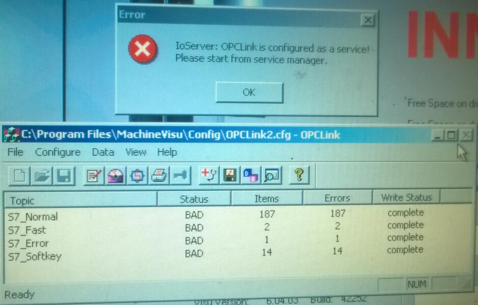 INTOUCH 软件和西门子PLC 通过OPClink通讯, 操作系统是windows2000, simatic net的设置显示OK,在运行软件是报图片中的错误 IOServer:OPCLink is configured as a service!Please start from service manager。 请教各位有碰到过这个问题吗?应该怎么解决呢?谢谢