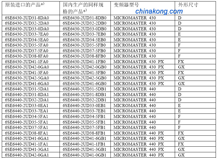 为了适合中国本地应用环境的要求, 西门子公司在天津SEDL(西门子电气传动有限公司)生产通用型变频器MM430和MM440的部分产品. 此产品充分考虑了中国电网和工厂使用环境的实际情况. 它们产品系列号的区别在于:变频器订货号(MLFB) 的最后四位数字—字符“* * A(或B)*”中, A表示国外原装进口的产品, B表示进口散件在中国国内生产的产品.例如, 6SE6430-2UD34-5EA0是国外原装进口的45kW, 380V,外形尺寸(FS)为E,不带滤波器的MM430变频器; 6SE6430-2UD34-5EB0 则是进口散件在中国国内生产的同样规格的不带滤波器的MM430变频器. 6SE6440-2UD41-1FA1是国外原装进口的110kW, 380V,外形尺寸(FS)为FX,不带滤波器的MM440变频器; 6SE6440-2UD41-1FB1 则是进口散件在国内生产的同样规格的不带滤波器的MM440变频器. 请用户在设计选型和使用时注意它们的区别.