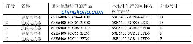 此外, 为了降低用户在设备成套时的成本, 西门子公司将逐步本地化生产与变频器配套使用的进线电抗器和输出电抗器. 下面是目前可以供货的本地化生产的进线电抗器与原装进口的进线电抗器型号对比表: