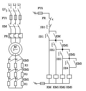 图1、按钮操作绕线式电动机串电阻起动控制线路