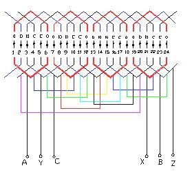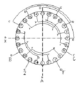 2.将外圆上第一个a、b、c组与最后一个a、b、c组作为电动机的进线A、B、C和出线X、Y、Z。