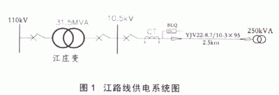 新安县电业局江路线为(电压等级110/10 kV)供给高速公路收费站的一回电缆专线,电缆长度2.5 km,收费站内安装250 kVA配变一台(额定电流14.43 A).为确保计量准确度,使互感器额定一次电流和最大负荷电流相接近,选用TA为LAJ-10变比20/5,江路线供电系统见图1.