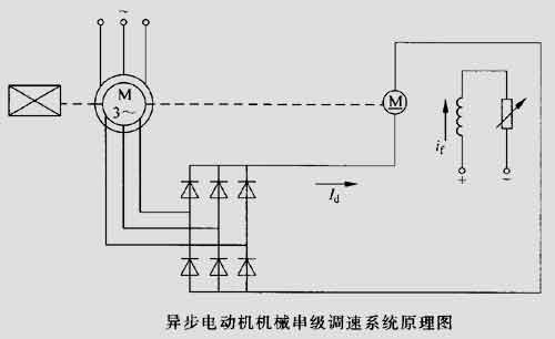 机械串级调速系统,在国际上又称为 Kramer 系统,其原理图如图所示。异步电动机转子电动势经整流后,接到一台与异步电动机同轴相连的直流电动机上,共同拖动负载。系统中直流附加电动势由直流电动机产生,通过改变直流电动机的励磁电流的大小就可改变电枢感应电动势,相当于改变直流附加电动势的大小,从而实现串级调速。